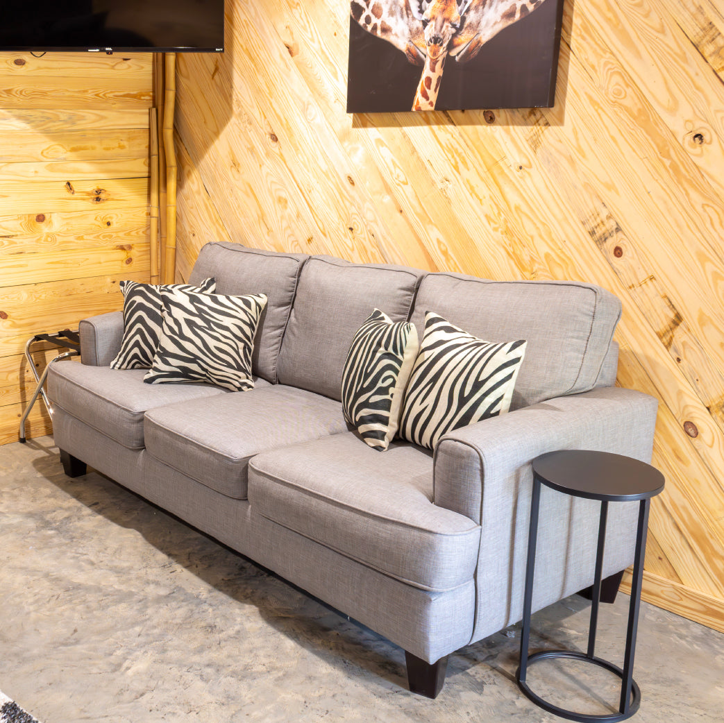 Long Neck Lodge, an inviting downstairs suite with giraffe decor, accommodates up to six guests with queen bunks and a queen sofa sleeper. Experience feeding giraffes through your suite window, and enjoy access to the petting zoo and safari drive-through. The suite includes an en suite bathroom, a mini fridge, Keurig, and plush linens.