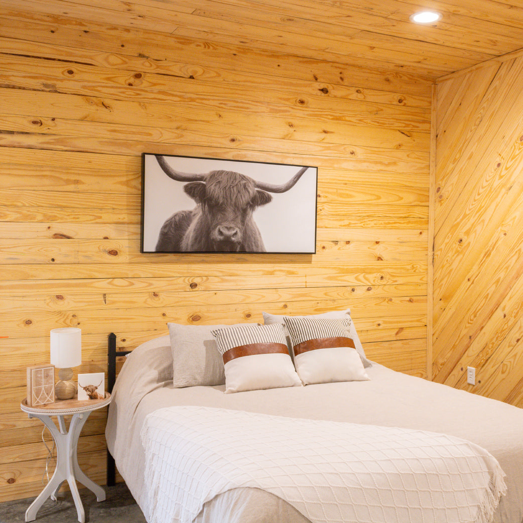The Serenity Suite, located downstairs, features a queen bed and a queen sofa sleeper, accommodating up to four guests with highland cow decor. Enjoy giraffe feeding from your suite, and access to the petting zoo and safari drive-through. The suite includes an en suite bathroom, a mini fridge, Keurig, and plush linens.