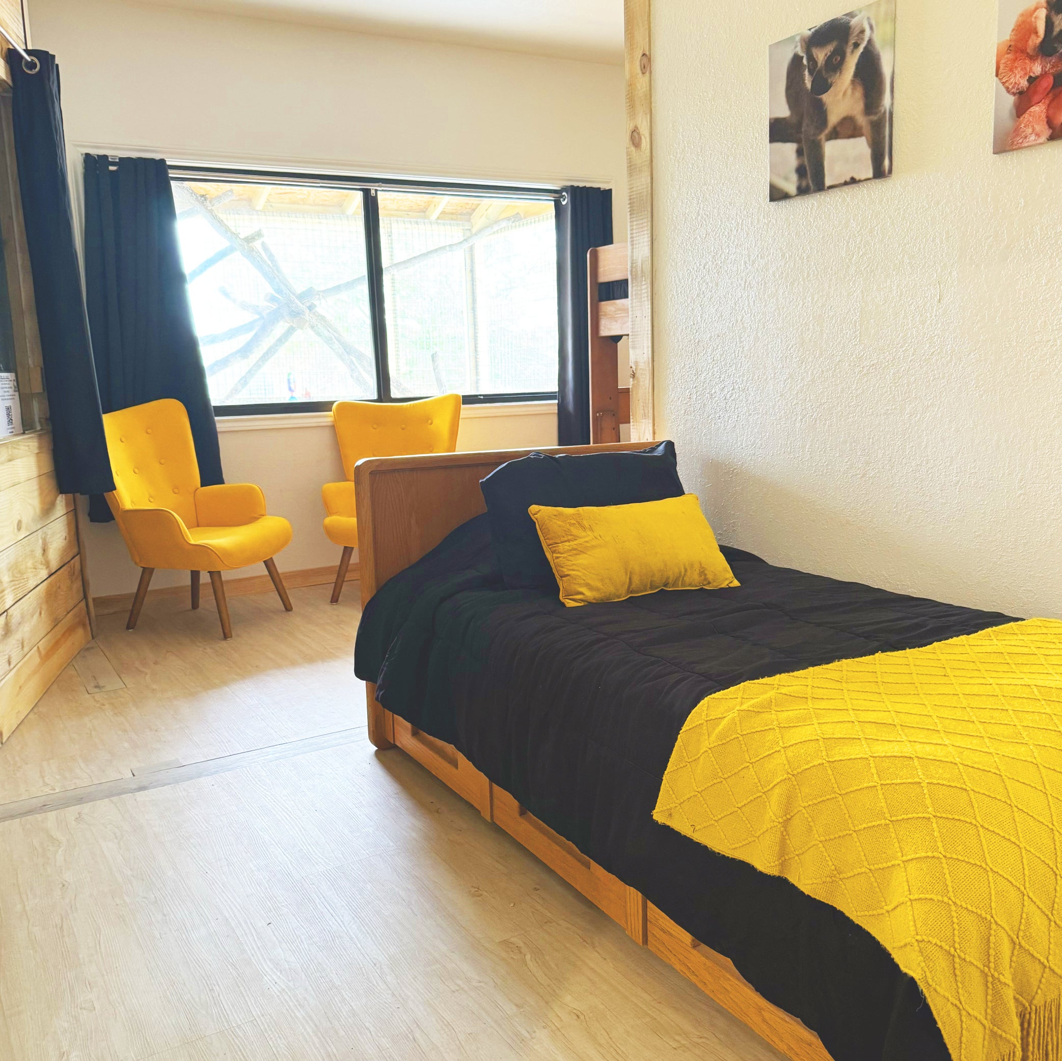 Enjoy the Ringtail Retreat (Room 13), designed with Queen Bunks + Twin bed accommodating 5 guests. Situated above the general store, this room offers a coffee station and a sitting area with views of the Safari. Includes access to communal bathrooms. Includes one VIP Lemur Encounter